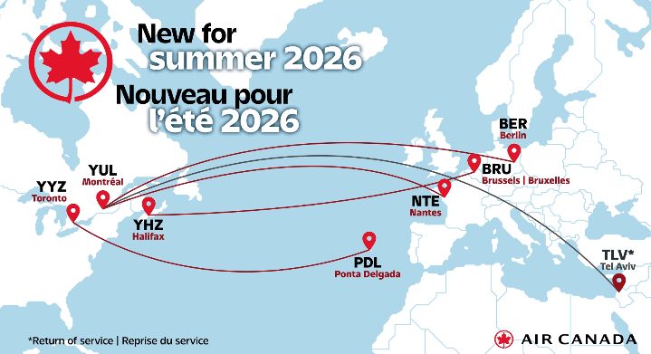 Nyní společnost oznámila, že z Montréalu bude ještě nově létat do Berlína, Nantes a do Tel Avivu. Z Toronta přidá Air Canada let na Azory, na letiště Ponta Delgada. Z Halifaxu pak přibudou přímé lety i do Bruselu.