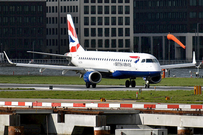 Embraer E190 společnosti BA Cityflyer, březen 2020 (autor: Anna Zvereva, Wikimedia Commons, CC-BY-SA-2.0)