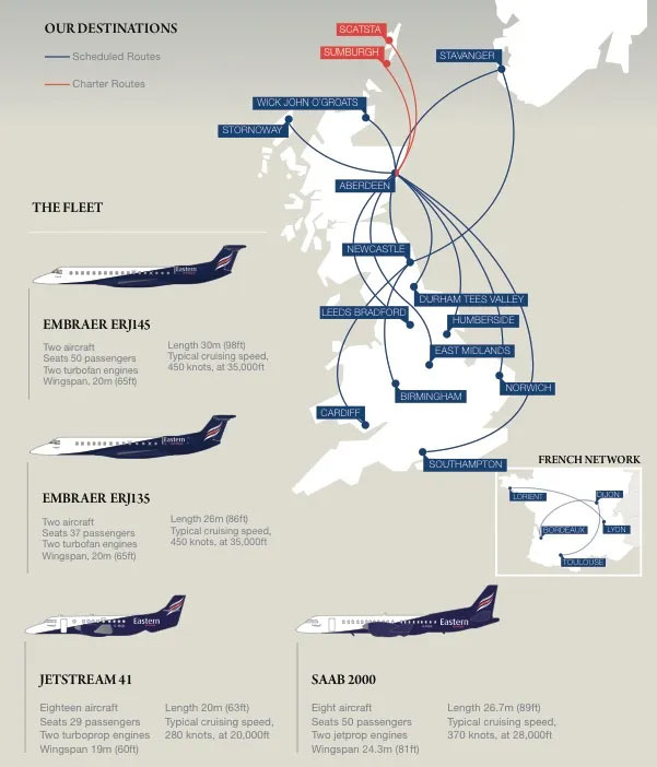 Letecká společnost Eastern Airways byla jednou z mála posledních regionálních aerolinií ve Velké Británii. Společnost sídlící na letišti v Humberside byla založena v roce 1997 jako malá aerolinie Air Kilroe. Provoz zahájila v roce 1999 lety na první lince z Humberside do Aberdeenu. Eastern Airlines se postupně etablovaly na regionálních trasách a provozovaly linky po celé Británii. V minulém desetiletí aerolinie létala nejvíce linek z Aberdeenu a Newcastlu.
