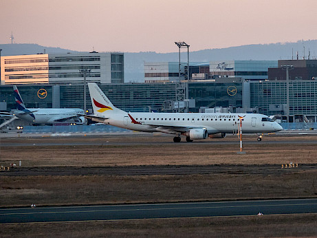 Embraer E190 společnosti German Airways na letišti ve Frankfurtu, únor 2025 (autor: Matti Blume, Wikimedia Commons, CC-BY-SA-2.0)