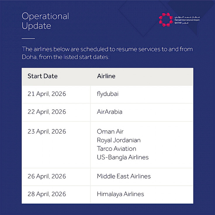 Jako první se do Dauhá vrátila v úterý 21. dubna nízkonákladová aerolinie flydubai, která obnovila linku z Dubaje. O den později začala ze Šardžá opět létat Air Arabia. Dnes obnoví své lety do Dauhá letecké společnosti Oman Air, Royal Jordanian, Tarco Aviation a US-Bangla Airlines. V neděli má dojít k návratu libanonské společnosti MEA – Middle East Airlines a začátkem příštího týdne pak nepálského dopravce Himalaya Airlines.