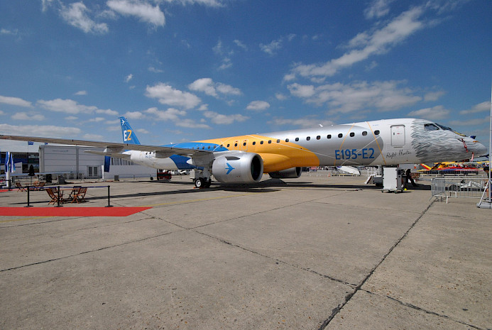 prototyp letadla E195-E2 pojmenovaný "profit hunter" na letecké show v Paříži, červen 2017 (autor: Marc Lacoste, Wikimedia Commons, CC-BY-SA-4.0)