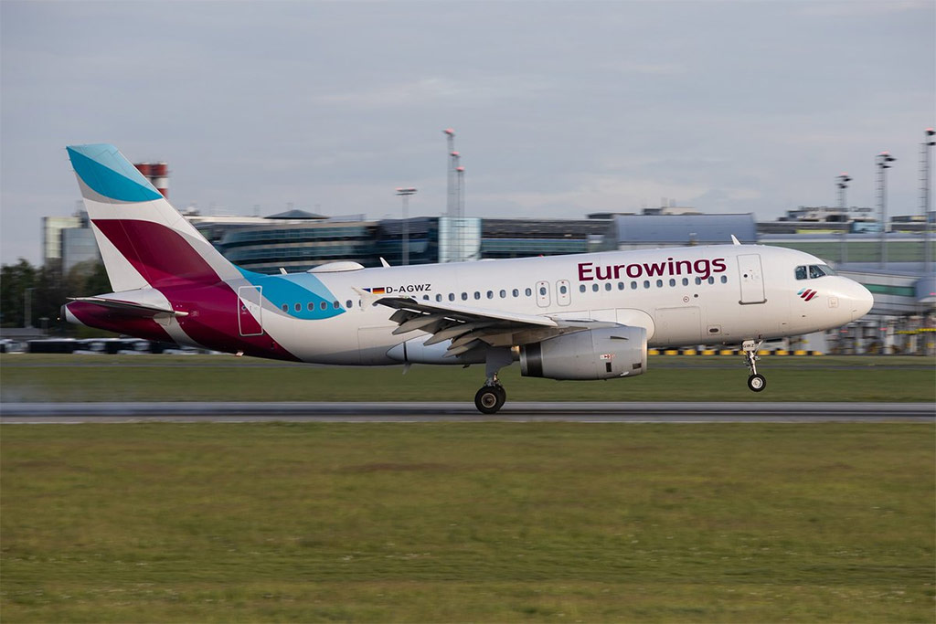 Airbus A319 společnosti Eurowings přistává na pražském letišti (foto: Letiště Praha)