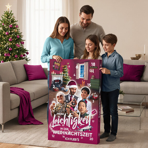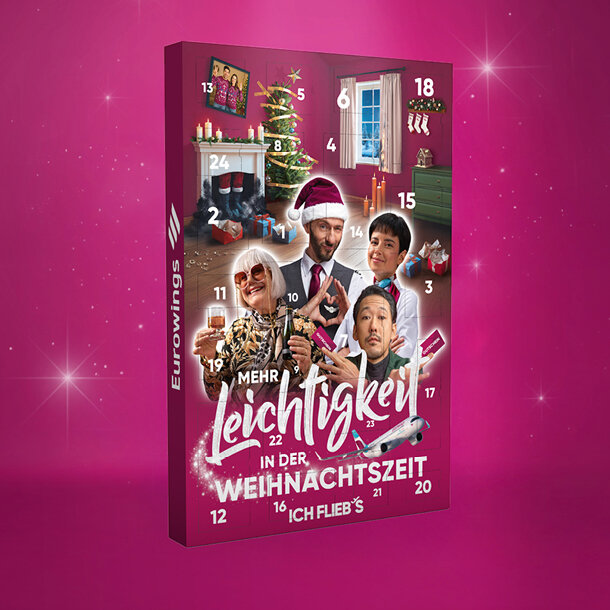 Letecká společnost Eurowings přišla ve svém e-shopu s novinkou. V předvánočním čase poprvé nabízí adventní kalendář. Není to nějaký běžný kalendář, jaký je nabízen v samoobsluhách s potravinami. Adventní kalendář totiž překvapí již svými rozměry. Jeho výška je 116 cm a šířka 75 cm. Váha kalendáře je 5,6 kg.