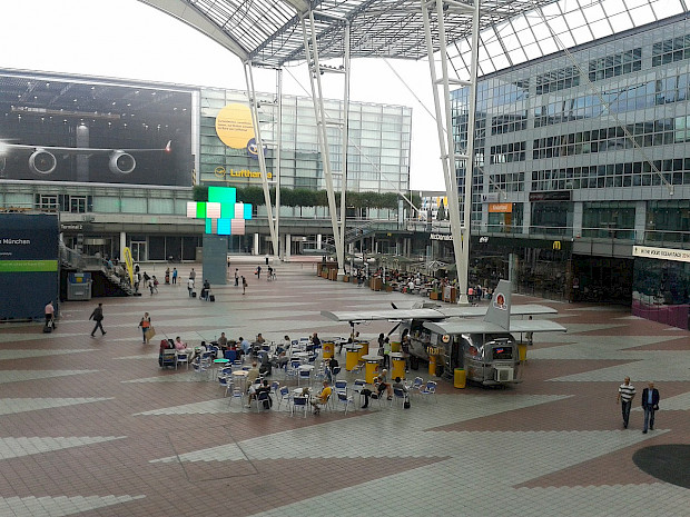 prostor mezi terminály na letišti v Mnichově, srpen 2014 (autor: Wald-Burger8, Wikimedia Commons, CC-BY-SA-3.0)