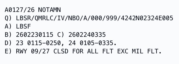 NOTAM informující o dočasném uzavření sofijského letiště (zdroj: OSINTdefender)