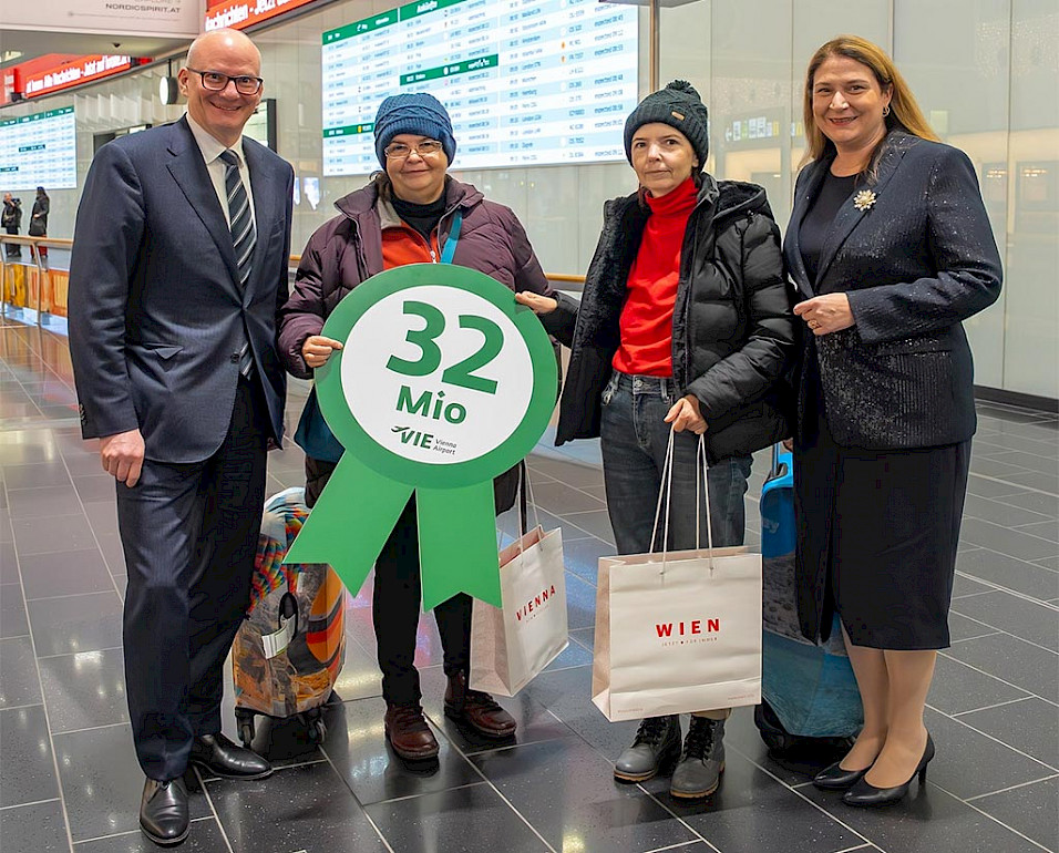 Rekordního 32milióntého cestujícího přivítali Barbara Novaková, vídeňská radní pro finance a hospodářství, a Julian Jäger, provozní ředitel vídeňského letiště. (foto: Flughafen Wien)