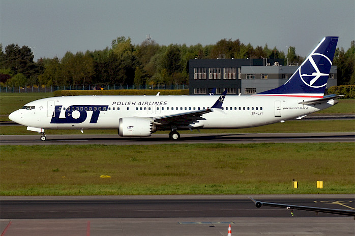 Boeing 737 MAX 8 společnosti LOT na letišti ve Varšavě, květen 2023 (autor: Anna Zvereva, Wikimedia Commons, CC-BY-SA-2.0)