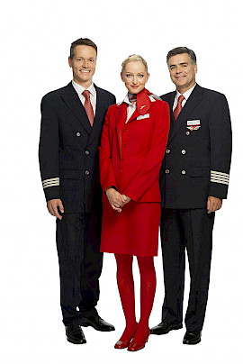 ilustrační obrázek - piloti a letuška v uniformách společnosti Austrian, prosinec 2013 (autor: Austrian Airlines, Wikimedia Commons, CC-BY-SA-2.0)