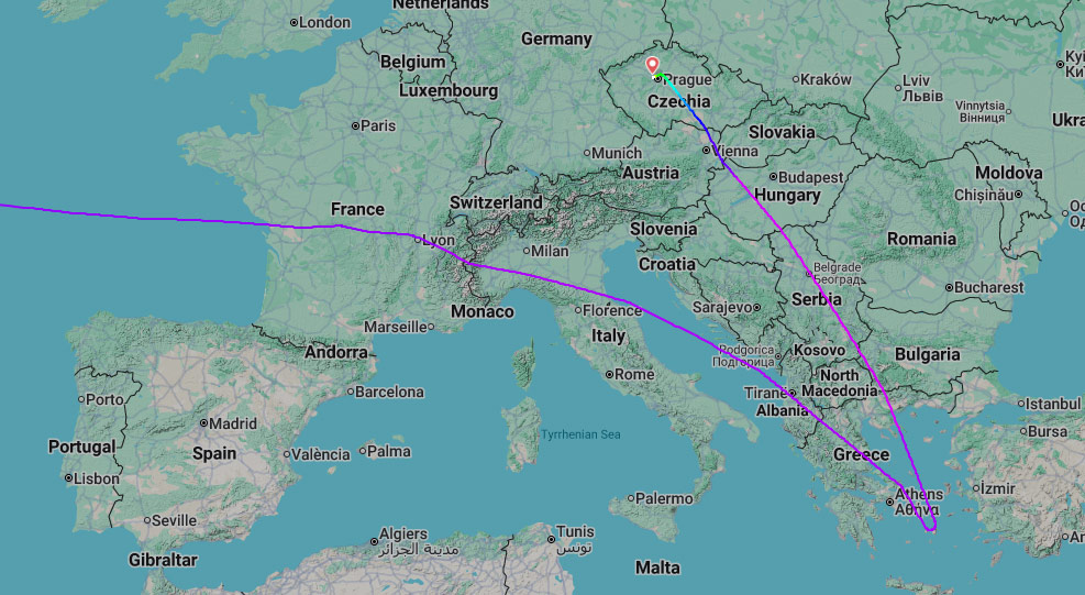 Airbus A380 registrace A6-EUI byl již u řeckého ostrova Naxos, když podle záznamu serveru Flightradar24 provedl otočku směrem k severu a zamířil do Prahy. Na pražském letišti letadlo pak přistálo v sobotu po 15. hodině.