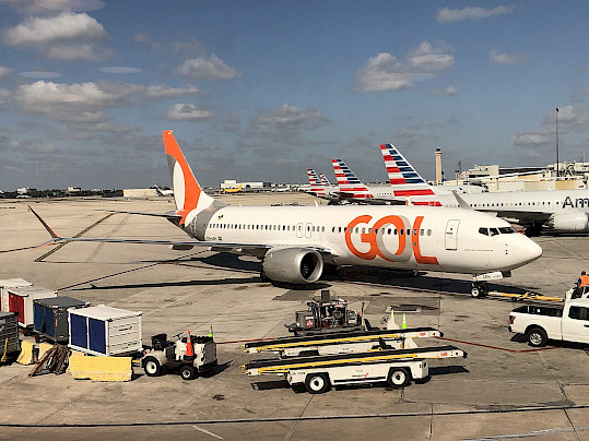 Boeing 737 MAX 8 společnosti GOL na letišti v Miami, kam přilétl na lince z brazilské Fortalezy, duben 2025 (autor: Tim, Wikimedia Commons, CC-zero)