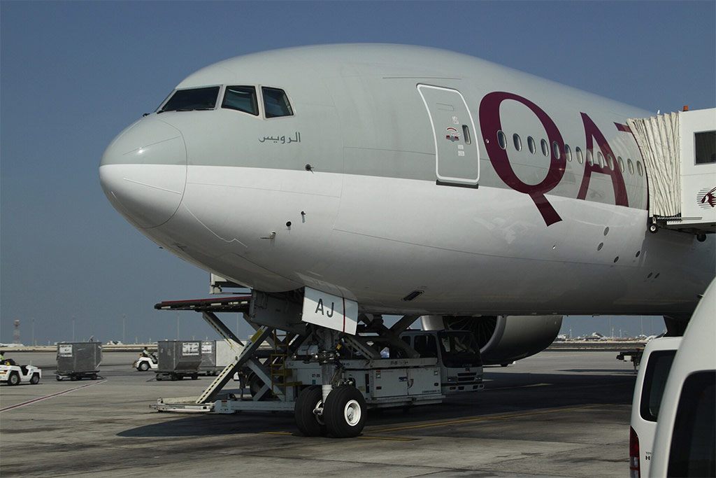 Boeing 777 Qatar Airways je odbavován na letišti v Dauhá (ilustrační foto: aeroprints.com/Wikimedia Commons - CC BY-SA 3.0)