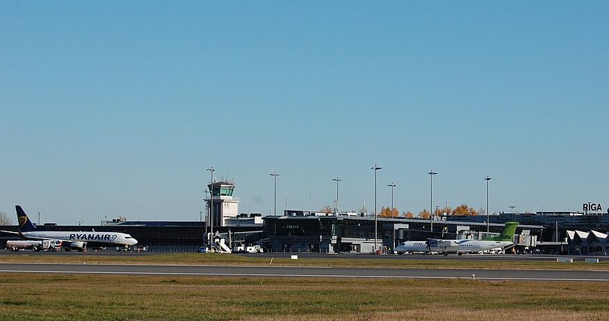 pohled na letadla Ryanairu a airBalticu na letišti v Rize, říjen 2015 (autor: Helmuts Rudzītis, Wikimedia Commons, CC-BY-SA-2.0)
