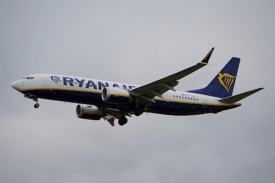 Boeing 737 MAX 8 společnosti Ryanair, říjen 2025 (autor: André Gerwing, Wikimedia Commons, CC-BY-SA-4.0)
