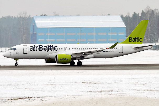 Airbus A220-300 společnosti airBaltic, prosinec 2018 (autor: Anna Zvereva, Wikimedia Commons, CC-BY-SA-2.0)