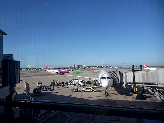 Letadla na Terminálu 2 na letišti El Prat v Barceloně, červenec 2019 (autor: Pere López Brosa, Wikimedia Commons, CC-BY-SA-4.0)
