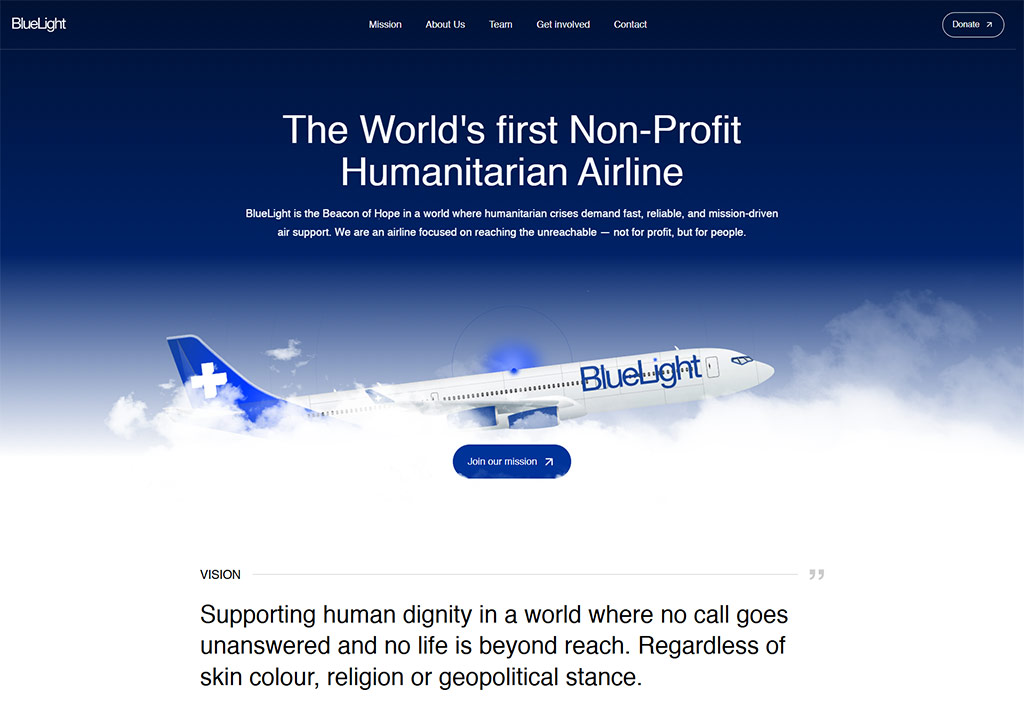 Webová stránka BlueLight Humanitarian Airlines (zdroj: bluelightairlines.org)