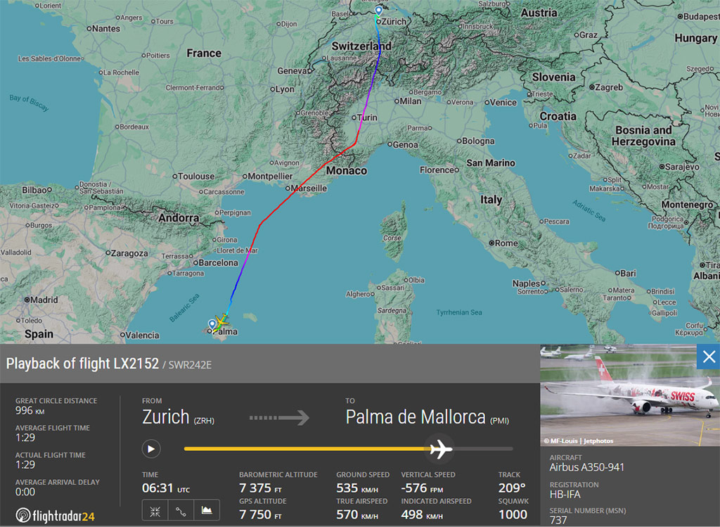 Letecká společnost Swiss nasadila poprvé svůj nový Airbus A350-900 na lety s cestujícími. Premiéra se uskutečnila v sobotu brzo ráno na pravidelné lince LX2152 do Palma de Mallorca. Z curyšského letiště airbus s registrací HB-IFA odstartoval v 7:11, o 40 minut později, než bylo plánováno. Na palubě bylo celkem 233 cestujících, kteří si mohli vyzkoušet novou kabinu pro dálkové lety Swiss Senses. Po hodině a půl letu pak A350 přistál na ostrově Mallorca. Při zpátečním letu pak musela posádka kvůli silnému větru přerušit přistání a na curyšském letišti přistála až na podruhé.