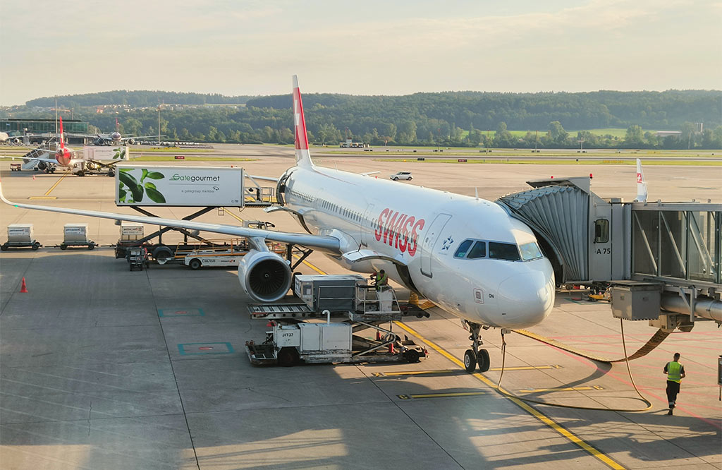 Airbus A320 společnosti Swiss je odbavován na letišti v Curychu (foto: Tomáš Hampl)