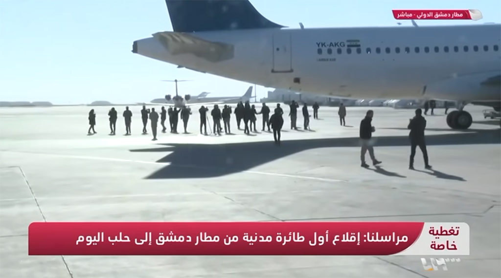 Letadla syrské národní letecké společnosti Syrian Air začala opět přepravovat cestující. Společnost ve středu vypravila vnitrostátní let z Damašku do Aleppa. Jednalo se o první komerční let od pádu prezidenta Bašára Asada. Airbus A320 (registrace YK-AKH) přepravil zhruba 40 cestujících zejména úředníků a novinářů. Letadlo bylo na zádi a na konci křídel opatřeno syrskou vlajkou, kterou používají povstalci.
