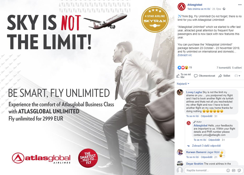 Jen několik dnů před zastavením provozu zveřejnila společnost nabídku AtlasGlobal Unlimited, neomezené cestování v business class na vnitrostátních a mezinárodních linkách za 2999 eur (zdroj: AtlasGlobal/Facebook)