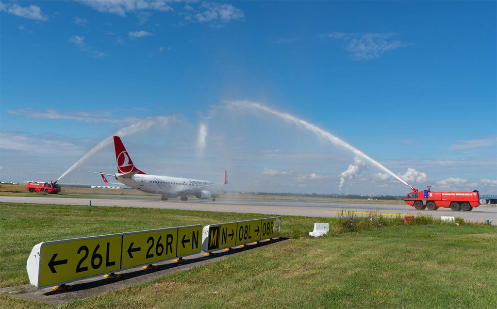 Přivítání Boeingu 737-800 Turkish Airlines na letišti v Lipsku v roce 2021, kdy společnost obnovila lety po pandemii Covid-19 (foto: Mitteldeutsche Flughafen)