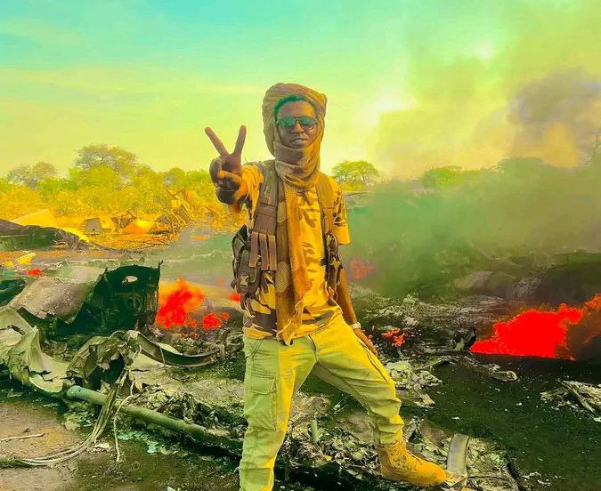 Příslušník jednotek RSF pózuje u trosek havarovaného Il-76 (foto: Sudan War Monitor)
