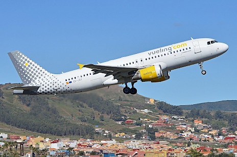 Airbus A320 společnosti Vueling startuje z letiště v Seville, leden 2016 (autor: Alan Wilson, Wikimedia Commons, CC-BY-SA-2.0)