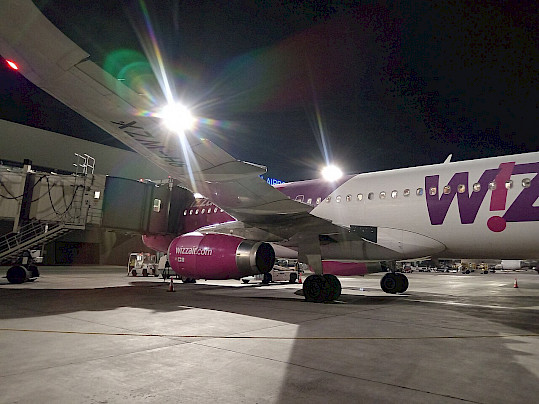 Airbus společnosti Wizz Air na letišti ve Skopje, srpen 2025 (autor: CAPTAIN RAJU, Wikimedia Commons, CC-Zero)