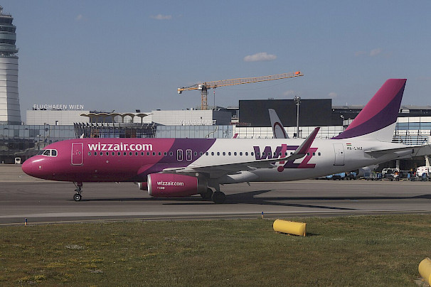 Airbus A320 společnosti Wizz Air na letišti ve Vídni, červen 2019 (autor: Andrewrabbott, Wikimedia Commons, CC-BY-SA-4.0)